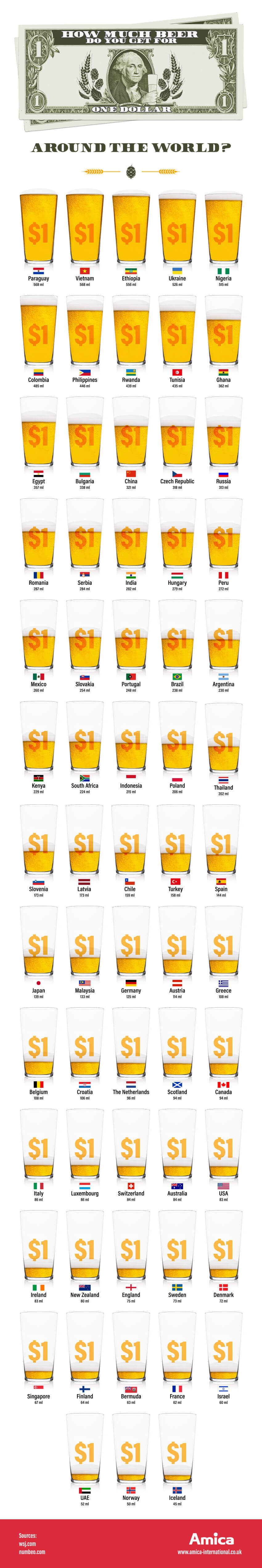 Вы когда-нибудь задумывались, насколько цена на пиво отличается по всему миру? Возможно, когда вы бываете за границей, вы возмущены ценой за пинту пива в местном баре? Или, наоборот, шокированы тем, насколько дешёвым оно бывает? Проект Amica-International сделал графику, показывающую, сколько пива вы можете купить за $1 в разных странах мира.