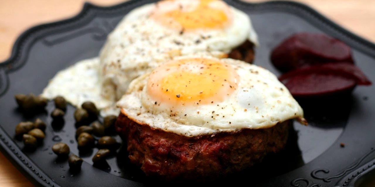 - Сформировать круглые котлеты диаметром 5-7 см. Разогреть в сковороде оставшееся масло и обжарить бифштексы на сильном огне, по 5-6 минут с каждой стороны. Можно подать, положив сверху жареное яйцо.